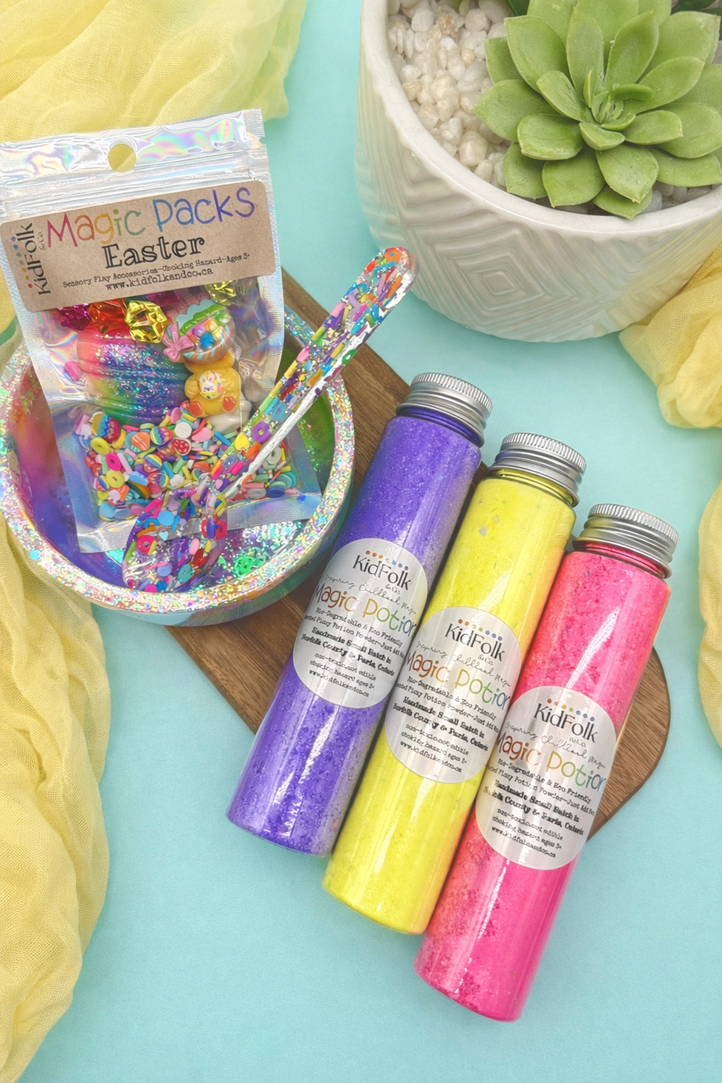 This Deluxe Easter Magic Potion Kit is bursting with pastel fizz, rainbow sparkle, and hands-on sensory fun — now with a reusable KidFolk resin Easter pastel bowl for the ultimate mixing moment.
