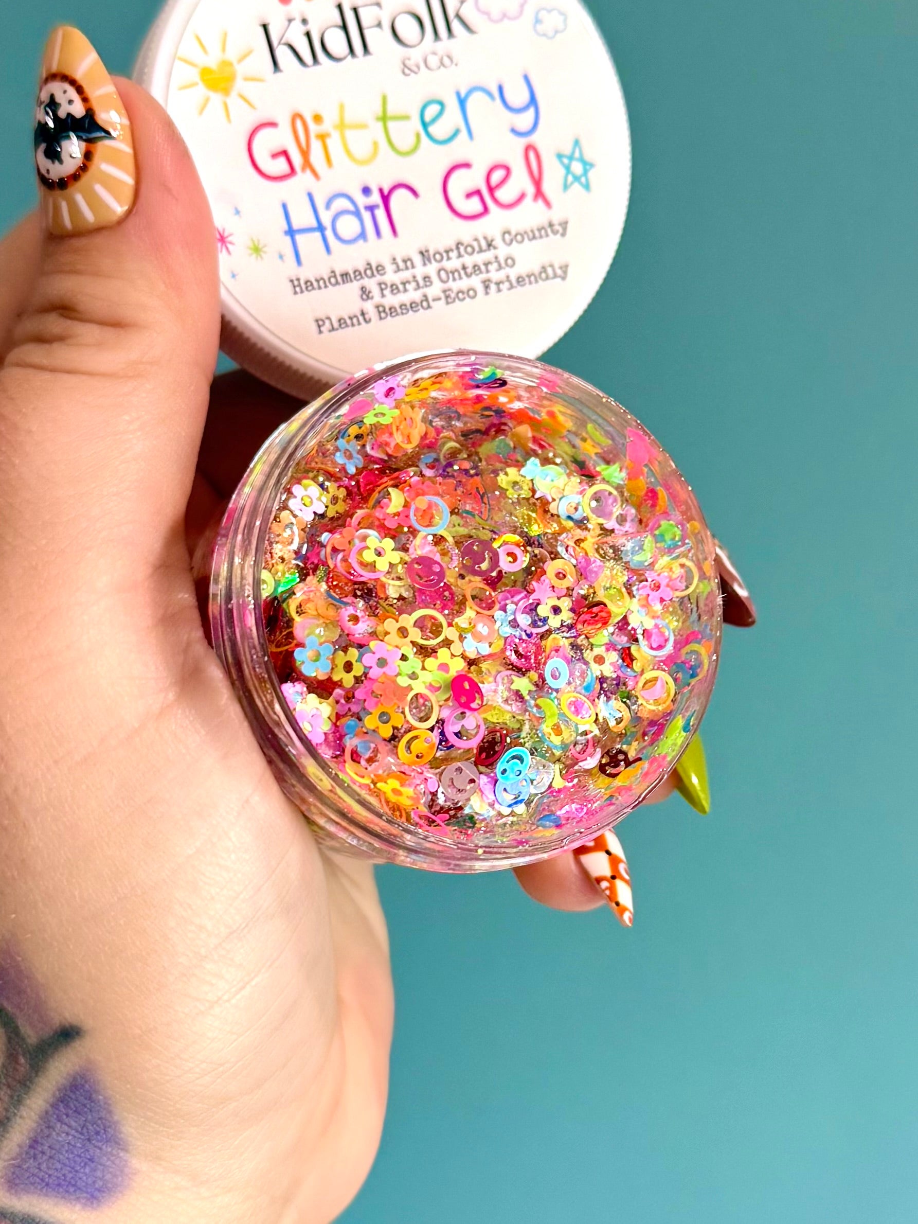 With 20 years of experience as a hairstylist and makeup artist, we’ve brought the same passion for fun festival looks, bold creative styling, and playful everyday sparkle into this jar. Whether you’re slicking back a pony, adding twinkles to space buns, or creating a glitter-kissed part line, this gel will keep your style in place while making it shine.