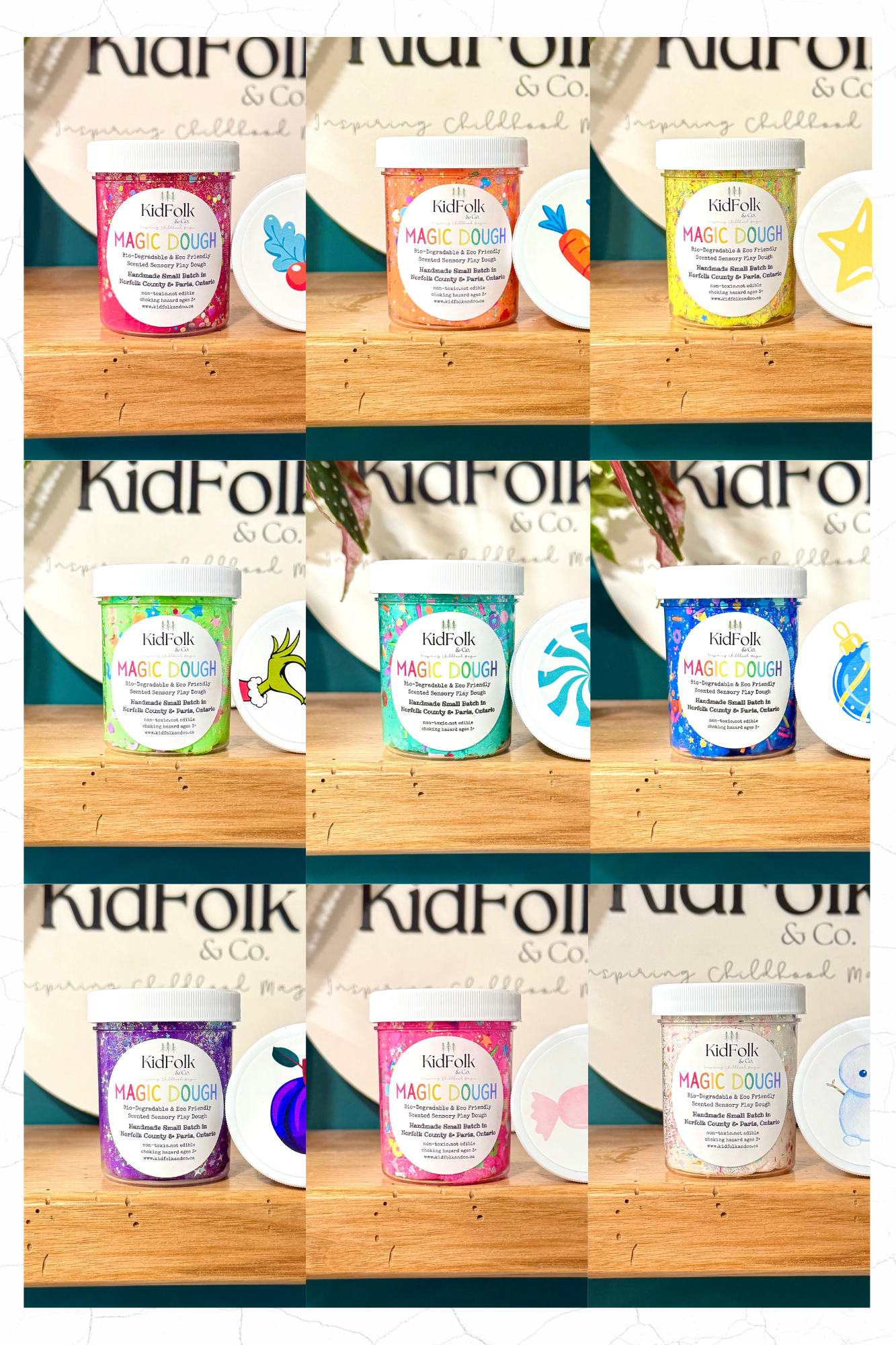 Our handcrafted Magic Dough Holiday Collection brings the sparkle of the season straight to your sensory table. Each dough is scented, sparkly, and handmade in Norfolk County β packed with festive glitter, colourful polymer clay sprinkles, and scents that capture the magic of Christmas play.